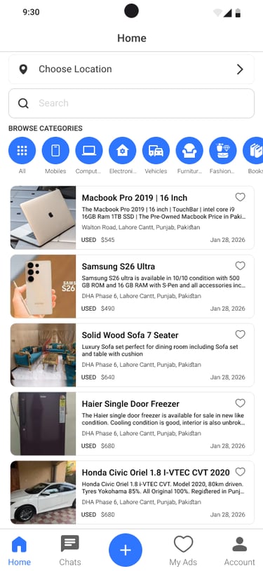 A trusted marketplace app where users can easily buy and sell used or pre-owned items such as electronics, furniture, vehicles, pets, and more. It connects local buyers and sellers, making safe, fast, and convenient deals through simple listings and direct chat.